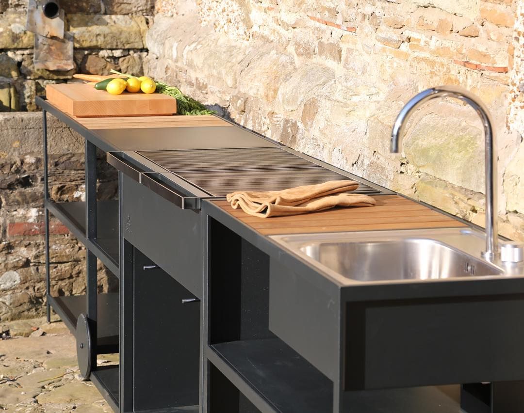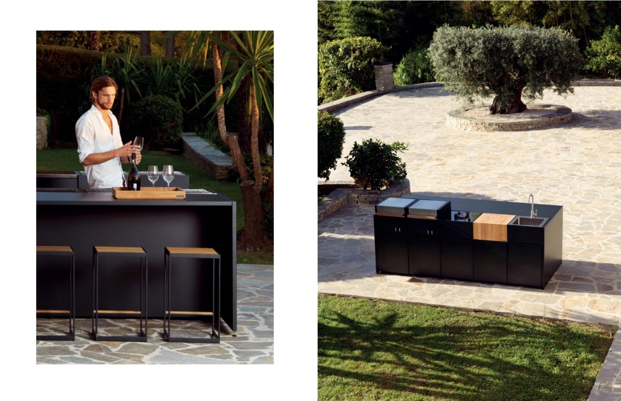 OPEN KITCHEN. В садовой серии кухонных модулей для открытых кухонь представлены модули из нержавеющей стали с порошковым устойчивым покрытием (кухонная мойка, рабочие поверхности с различными вариантами ящиков и стеллажей для хранения, модуль-плита, открытый буфет, шкафчики, шкаф с холодильником, тележка, гриль для барбекю на углях и газовый гриль) и также модуль из натурального тика с поверхностью для разделочных целей. Плюс в том, что вы сами строите комбинации для удовлетворения ваших же потребностей. Главный плюс — ничего лишнего, каждый элемент — неотъемлемый элемент для кухни на открытом воздухе.
