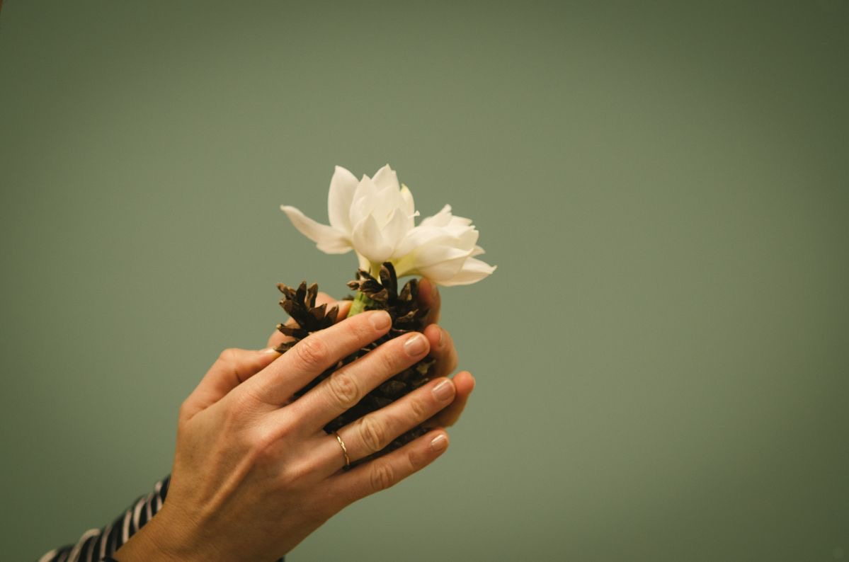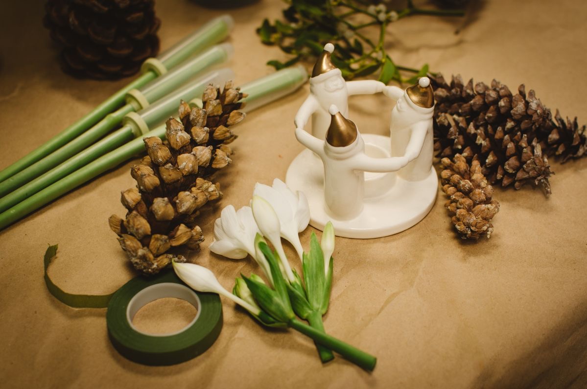 Мы начали с поцелуев, которых под омелой не миновать. Если Новый год без сосен никуда, значит без сосновых шишек тоже. В ближайший лес — за материалом, и можно браться за вазу, которую проще простого смастерить даже с детьми и без особенных инструментов. Главный инструмент — желание встретить наступающий год просто и с открытой душей.