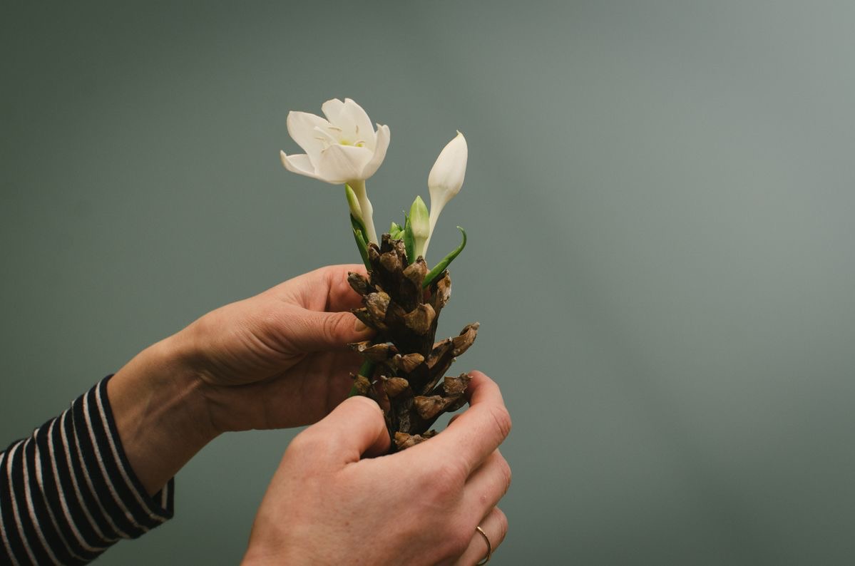 Отберите четыре крупные шишки продолговатой формы. Соедините их вместе, поместив в центре колбу или просто цветок. Затем небрежно, но прочно, обмотайте поделку нитью (шпагатом) несколько раз.