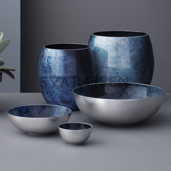 Твір мистецтва, натхненний архіпелагами Стокгольма. Подібно до відображень у спокійній воді, дизайн Horizon перетворюється на унікальні абстрактні візерунки синьо-зелених відтінків. У набір входять вази та миски трьох розмірів. Повний комплект від дизайн-дуету Bernadotte & Kylberg – незабутня картина.