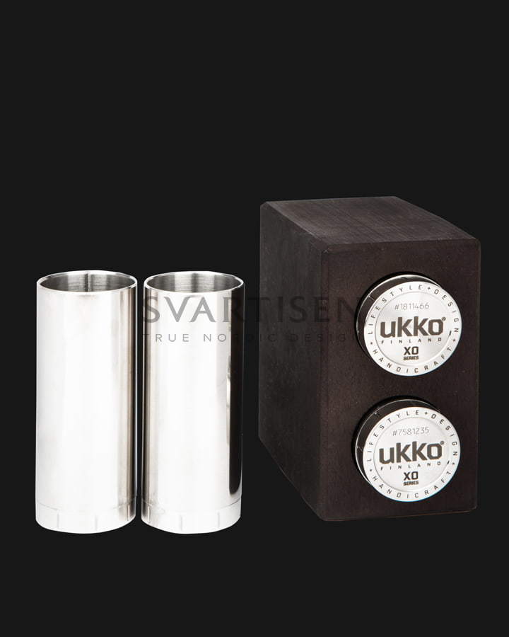 Знакомый дизайн с дополнительной шлифовкой. Подставка из карельской берёзы. Включает 2 стальные рюмки Ukko, которые держат прохладу охлажденных напитков надолго. Объём 40 мл.