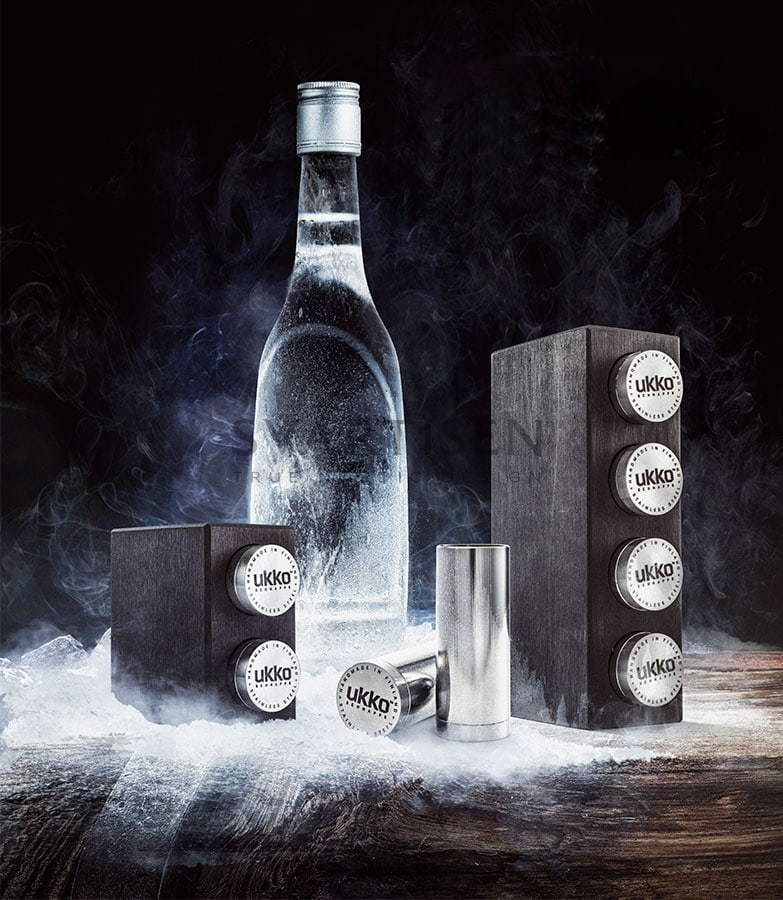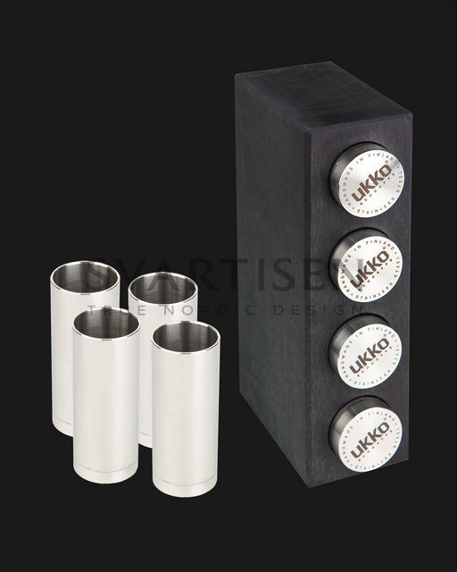Подставка из карельской берёзы. Включает 4 стальные рюмки Ukko, которые держат прохладу охлажденных напитков надолго. Объём 40 мл.