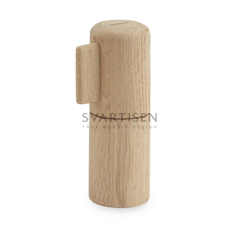 Paddle Grinder складається з керамічного контейнера для перемелювання перцю з дерев'яною кришкою із необробленого дуба.