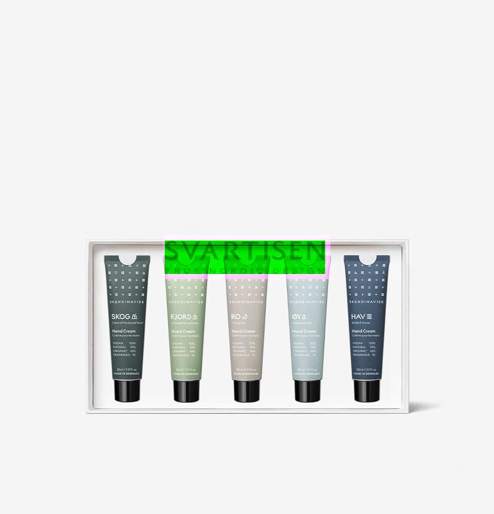 Подарунковий набір PROTECT містить по одному тюбику об’ємом 30 мл кожного з наших 5 міні-ароматів крему для рук: SKOG, FJORD, RO, ØY та HAV.