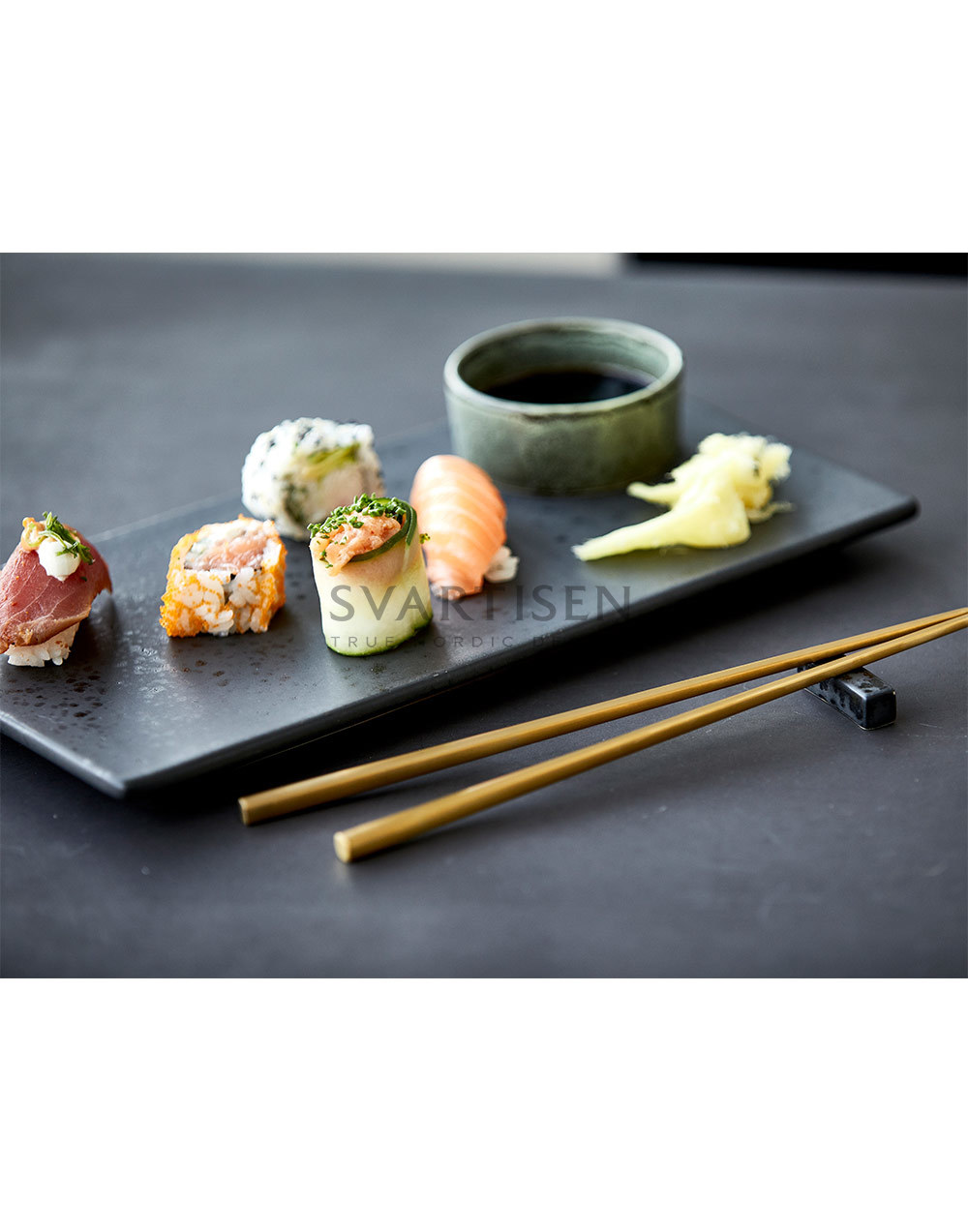 Красива тарілка прямокутної форми, ідеальна для подачі суші, але сир або невеликі закуски також чудово виглядають на ній.