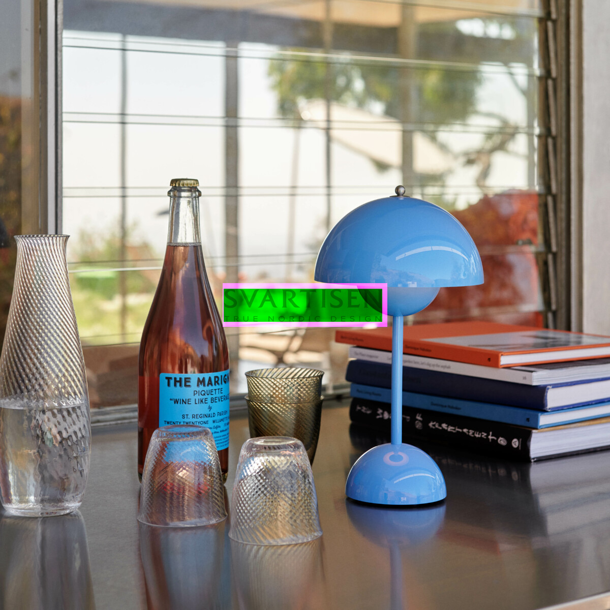 The Flowerpot, яскравий світильник із закругленою підвіскою, що звисає з напівкупольного верхнього плафона, втілює експериментальний підхід Вернера Пантона. Трохи менший за розміром, ніж версія настільної лампи, і навмисно легкий, портативний VP9 оснащений USB-кабелем для зарядки. Він доступний у широкому діапазоні сучасних кольорів і створить затишну атмосферу в приміщенні та на вулиці.