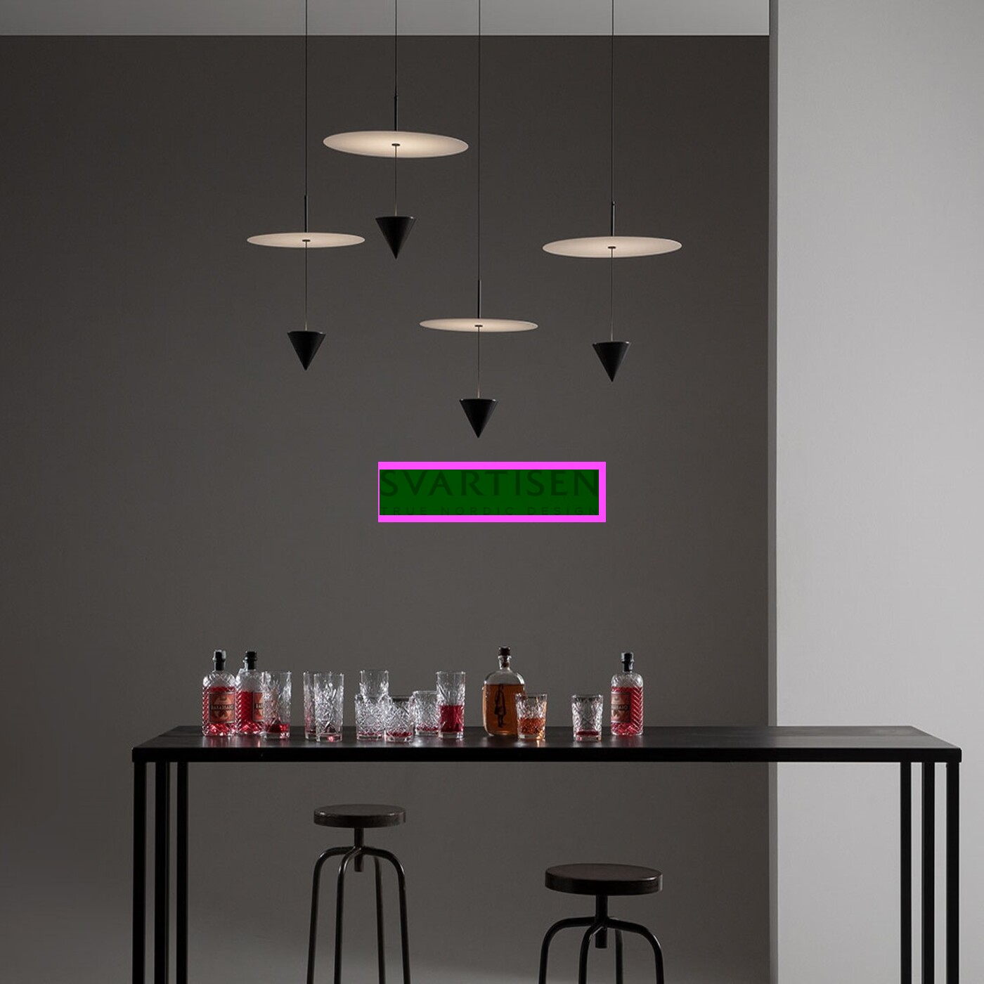 Stralunata - це колекція підвісних світильників з алюмінієвою чорною рамою та білою пластиною. Цей сучасний світильник з каталогу італійського бренду Karman. Бренд використовує високоякісні матеріали, поєднуючи сучасність і традиції з амбітними навичками, щоб створити його привабливість.